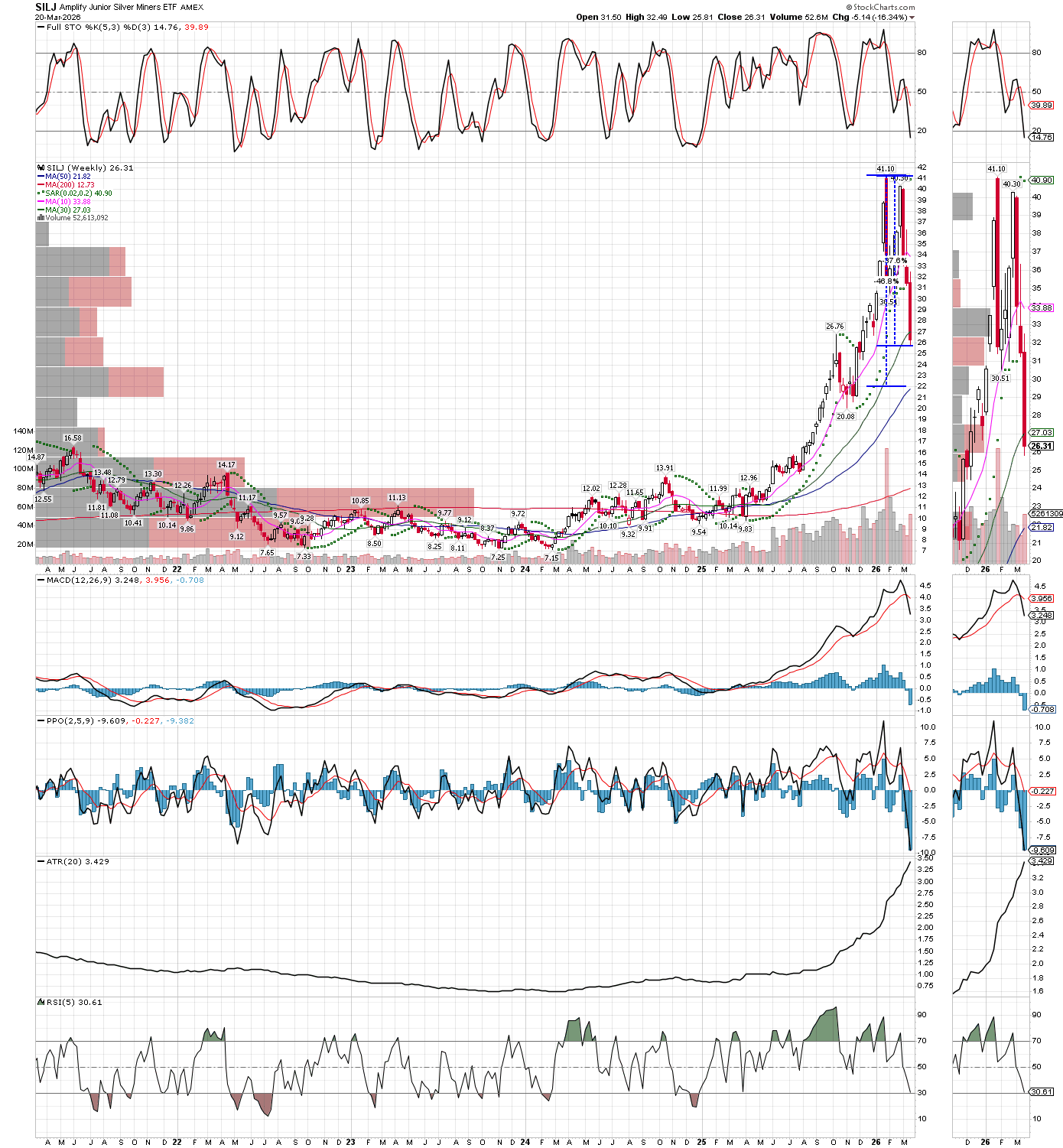 I will buy a lot more if SILJ can drop to its 12 month MA, only a few dollars away now, as the MA should be up near $24 by April 1, the new monthly print. See below the weekly stochastics are nearing oversold, lets wee how they look when next weeks starts, but the MACD weekly might still need some time to repair. I hope to be more fully invested before next Q1 earnings reports start being reported for miners in mid-May, as these will be their best reports in history. So, I am patiently waiting to get “heavy” again, and realize, even hope that my buys on Friday were early, and their prices drop a little further and run some more time down on the clock. In any case, another great buying opportunity lies in here somewhere, but as always, the most important part of any bet is the position sizes one take. I will stick to 3% total portfolio risk on these entries, and might even look to take some profits one the earnings news when they come out. In other words, this trade is likely not the long term buy and hold I advocated early in the bull, rather a trade around the intermediate cycles that last just a few months. I still think the general stock market is going to have a much deeper pullback (maybe after a short rally first because already oversold), and this could drag down the metals and miners for a better long-term entry again, maybe late in the year, like October or November. Then will look to buy and hold again for the remainder of the bull, which should still have a few years in it, and big percentage gains. It might take a little while, but I fully expect the metals and miners to make new all-time highs before the bull is finished.